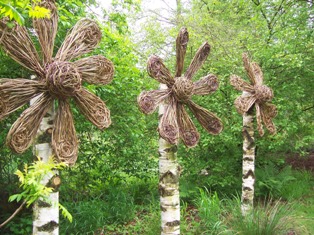 This is the second time I have exhibited at this summer long exhibition at Sir Harold Hillier Arboretum near Romsey. Arriving with a car full of tools, willow flowers and willow, I found three heavy silver birch trunks lying on the ground close to where I was to have my installation. I dug deep holes it the sticky clay soil and had help lifting the trunks into them. I balanced on a ladder as I attached the flowers, making sure they were going to be strong enough to survive the vagaries of the next 5 months’ weather.