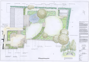 This garden has an outlook onto rolling Somerset hills and was commisioned by a bee keeper. Local stone was used to create a curved dry stone retaining wall, the planting was more formal (blues and purples) nearest the house merging to less formal dogwoods for winter colour and structure further away from the house. An emphasis on underplanting of early and late flowering plants (including bulbs) was used to extend the season of pollen and nectar.