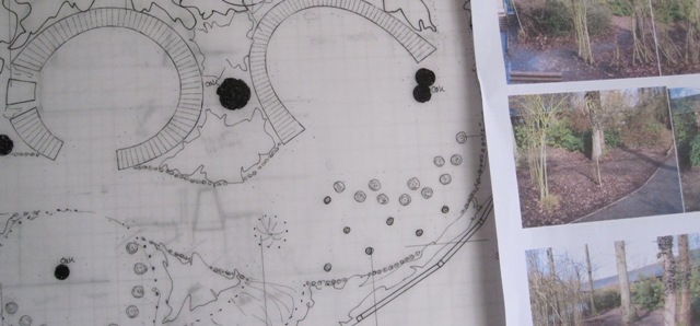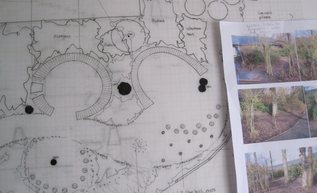A school set in beautiful oak woodland asked me to create an outdoor reading room for pupils to incorporate native bulbs, scented shrubs, (reinstated) living willow structure, oak benching, log seating, areas for sculptures, etc…