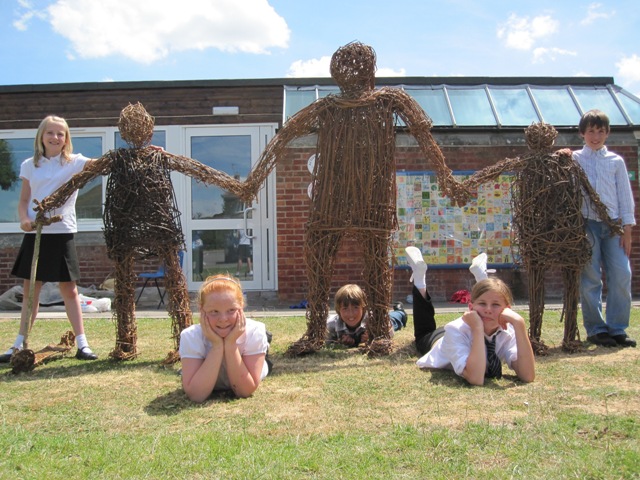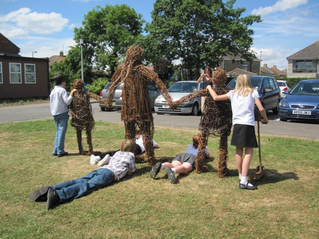 Willow People – Wiltshire Posted on July 9, 2010April 26, 2012Author adminPosted in schools, willow, workshops Lots of willow, three days of glorious sunshine and year 6 pupils resulted in three exciting figures complete with scooter.